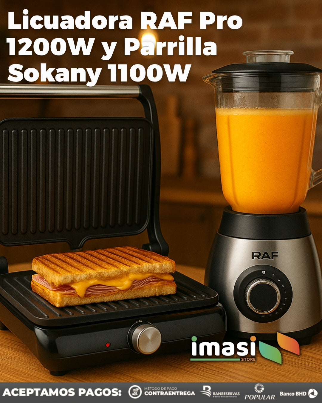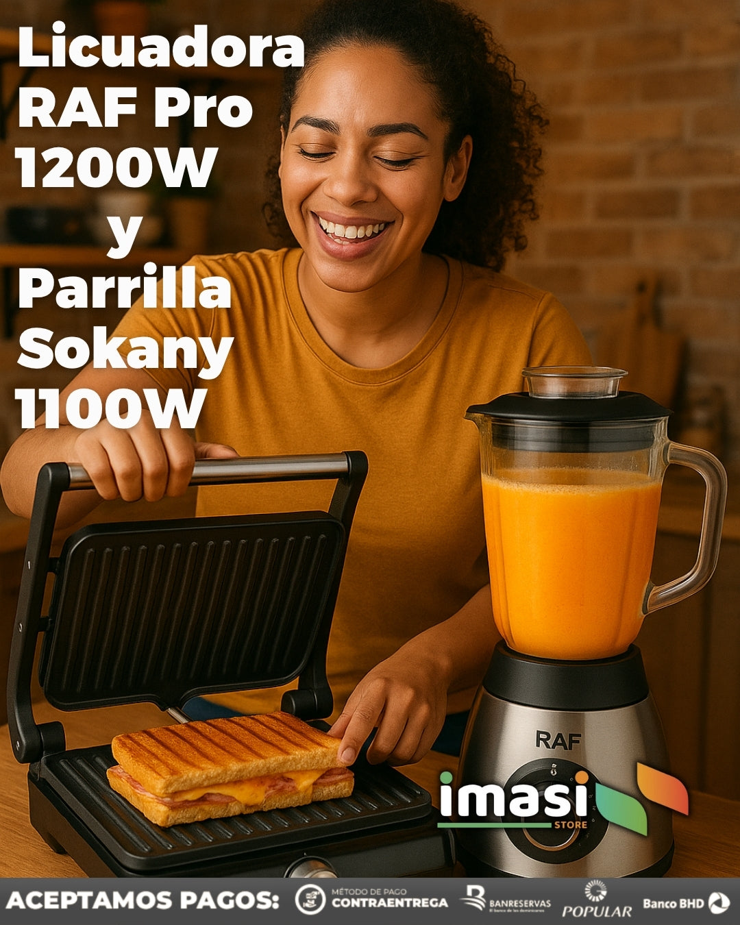 Con la Licuadora RAF Pro 1200W y la Parrilla Sokany 1100W, disfruta potencia profesional desde tu hogar.
