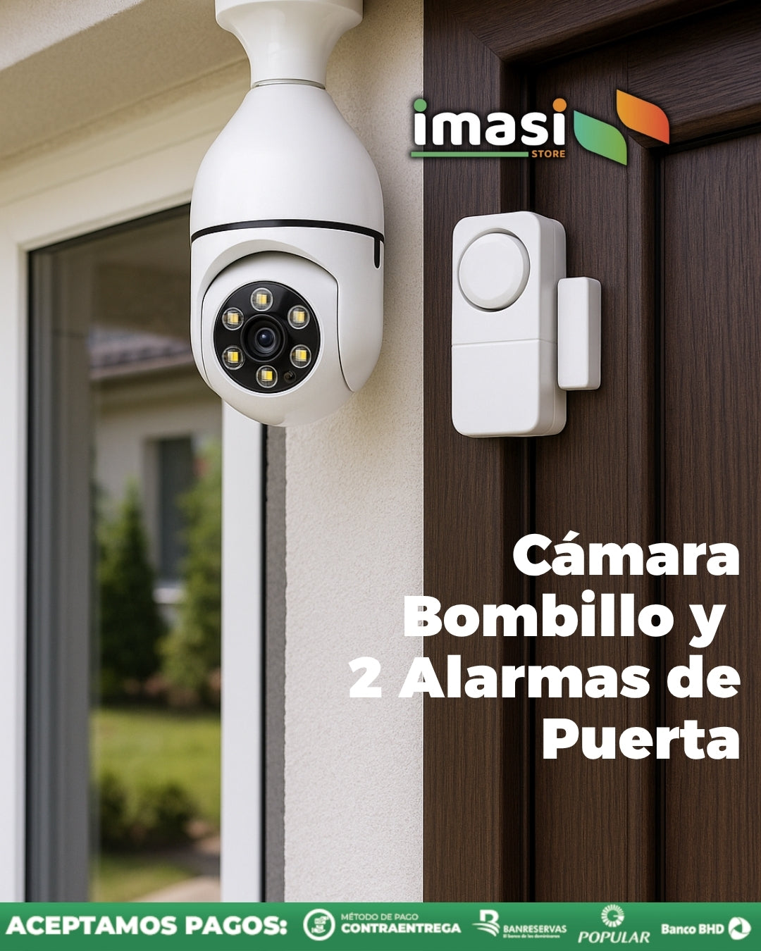 Este combo te da vigilancia 360° + disuasión inmediata en los puntos críticos de tu casa: ves y hablas desde el celular, recibes alertas por movimiento y, si abren una puerta, suena la sirena al instante. Se instala en minutos (bombillo E27 + adhesivo 3M), sin técnicos ni mensualidades, te permite guardar evidencia en microSD y te ofrece tranquilidad real al mejor costo.