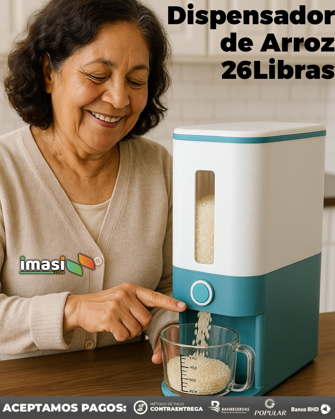 Porque es la forma más práctica, higiénica y moderna de almacenar tu arroz y granos en casa. Con él te olvidas de las fundas rotas, del arroz regado y de la humedad que daña tus alimentos. Su gran capacidad de 12KG asegura que siempre tengas suficiente arroz disponible para tu familia, y gracias a su diseño con ventana transparente y medidor incluido, podrás servir de manera exacta y sin desperdicios. Además, con envío gratis, pago al recibir y garantía, no corres ningún riesgo.