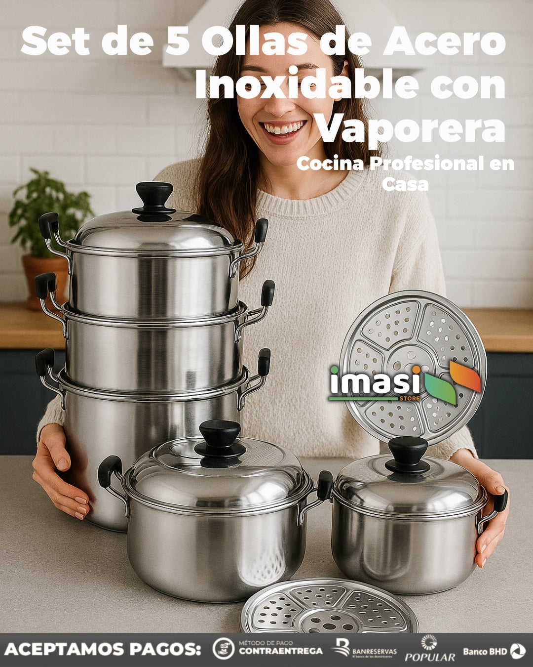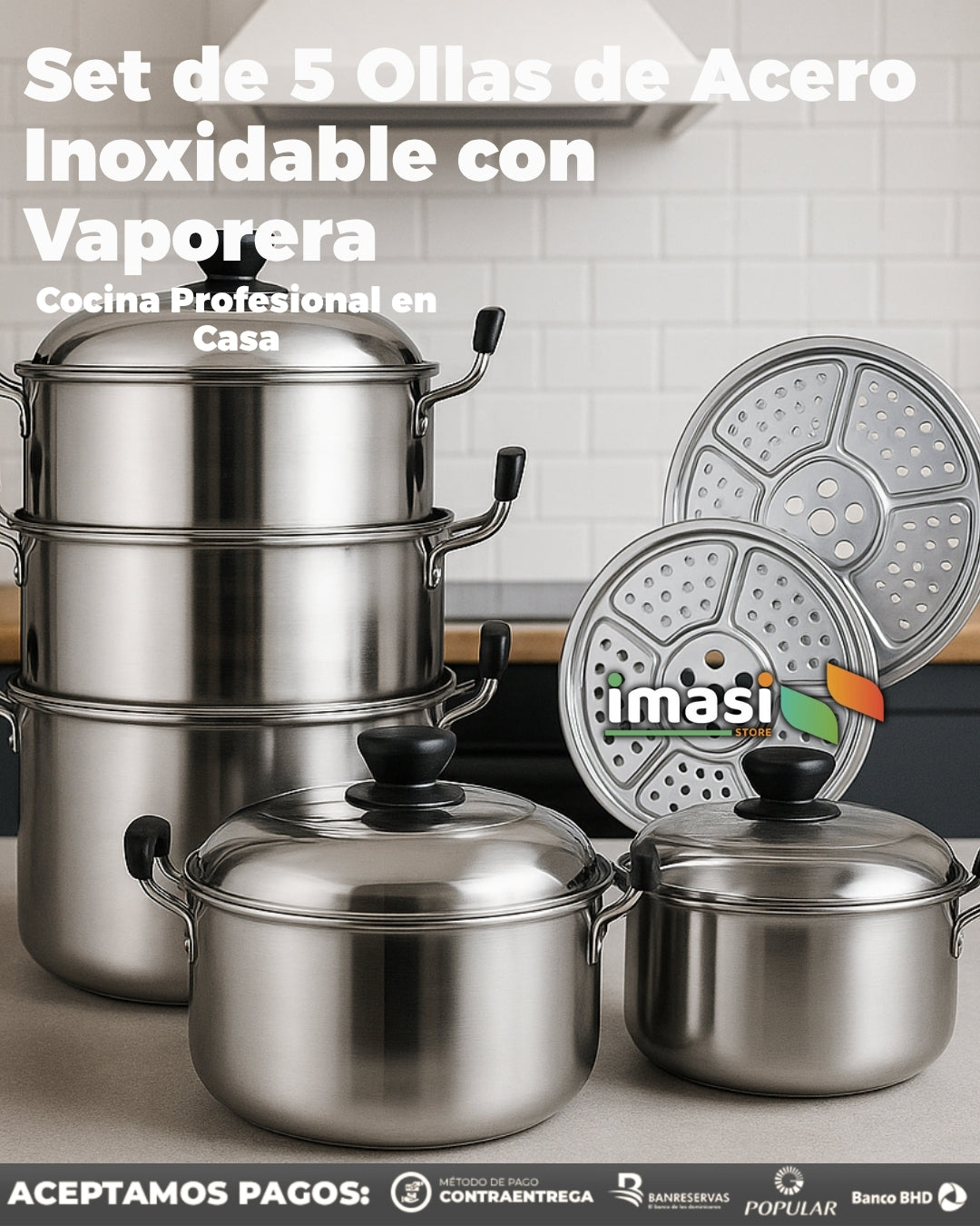 Con nuestro Set de 5 Ollas de Acero Inoxidable con Vaporera, cocina más, gasta menos y luce tu espacio con estilo.