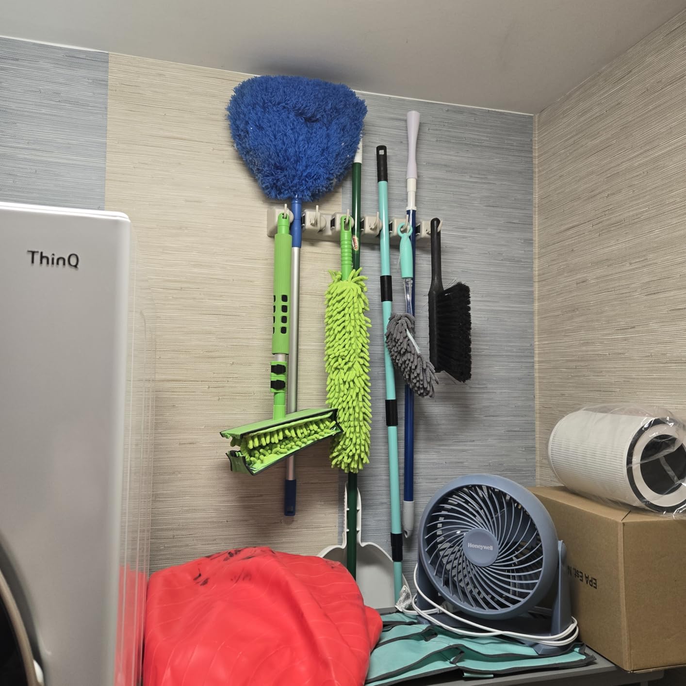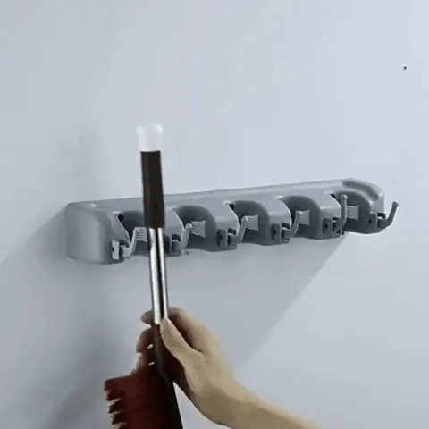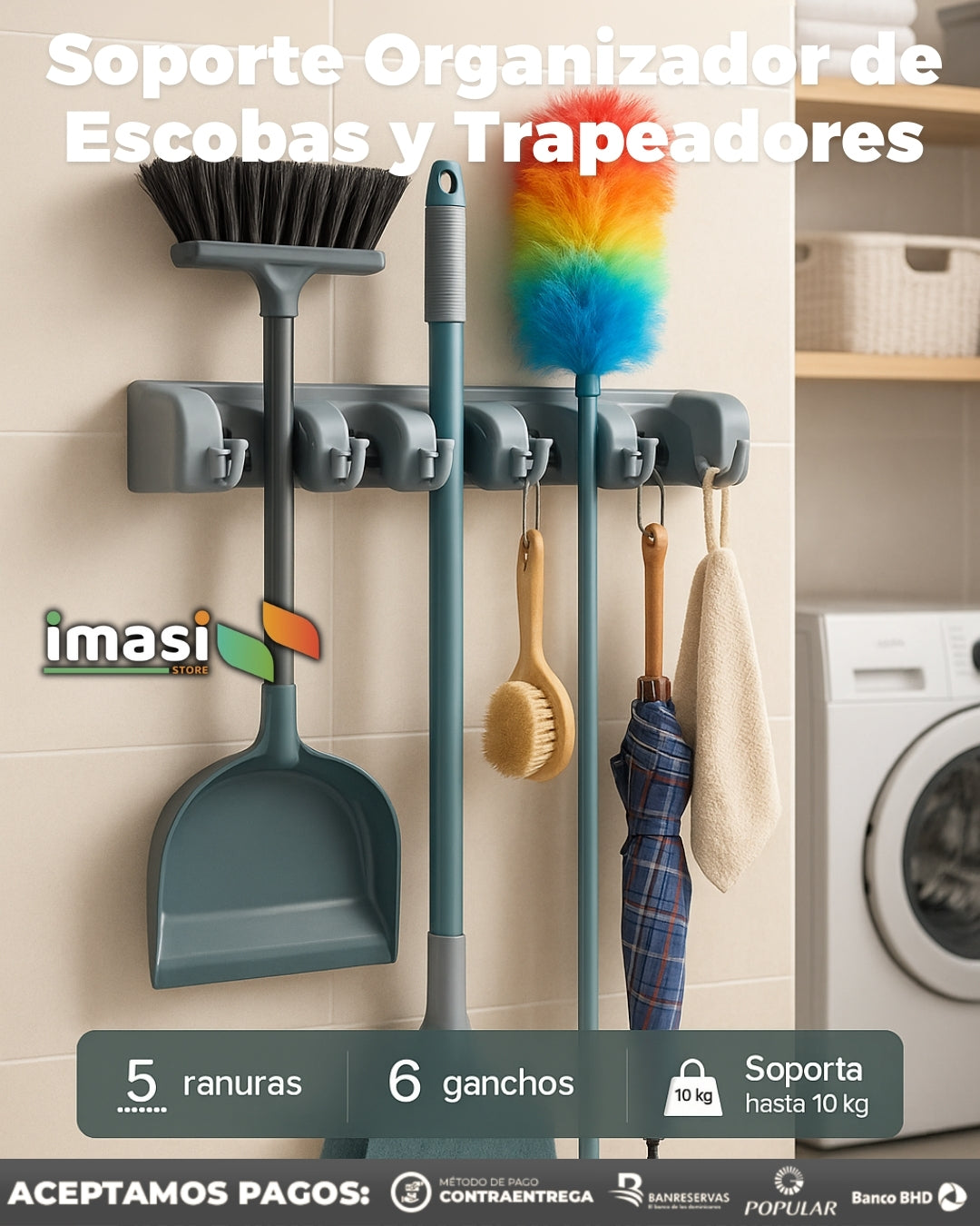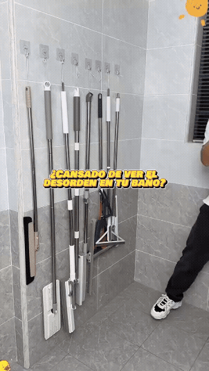 ¿Escobas y suapes por el piso? Ordena en minutos con el Soporte 5×6 (10 kg): 5 ranuras autoajustables + 6 ganchos para todo tu equipo de limpieza. Ideal para cocina, lavadero y baño.