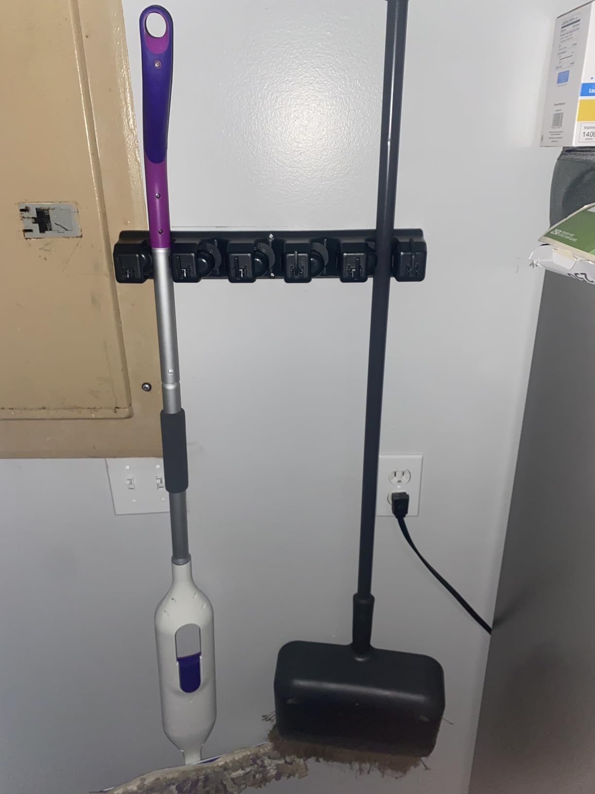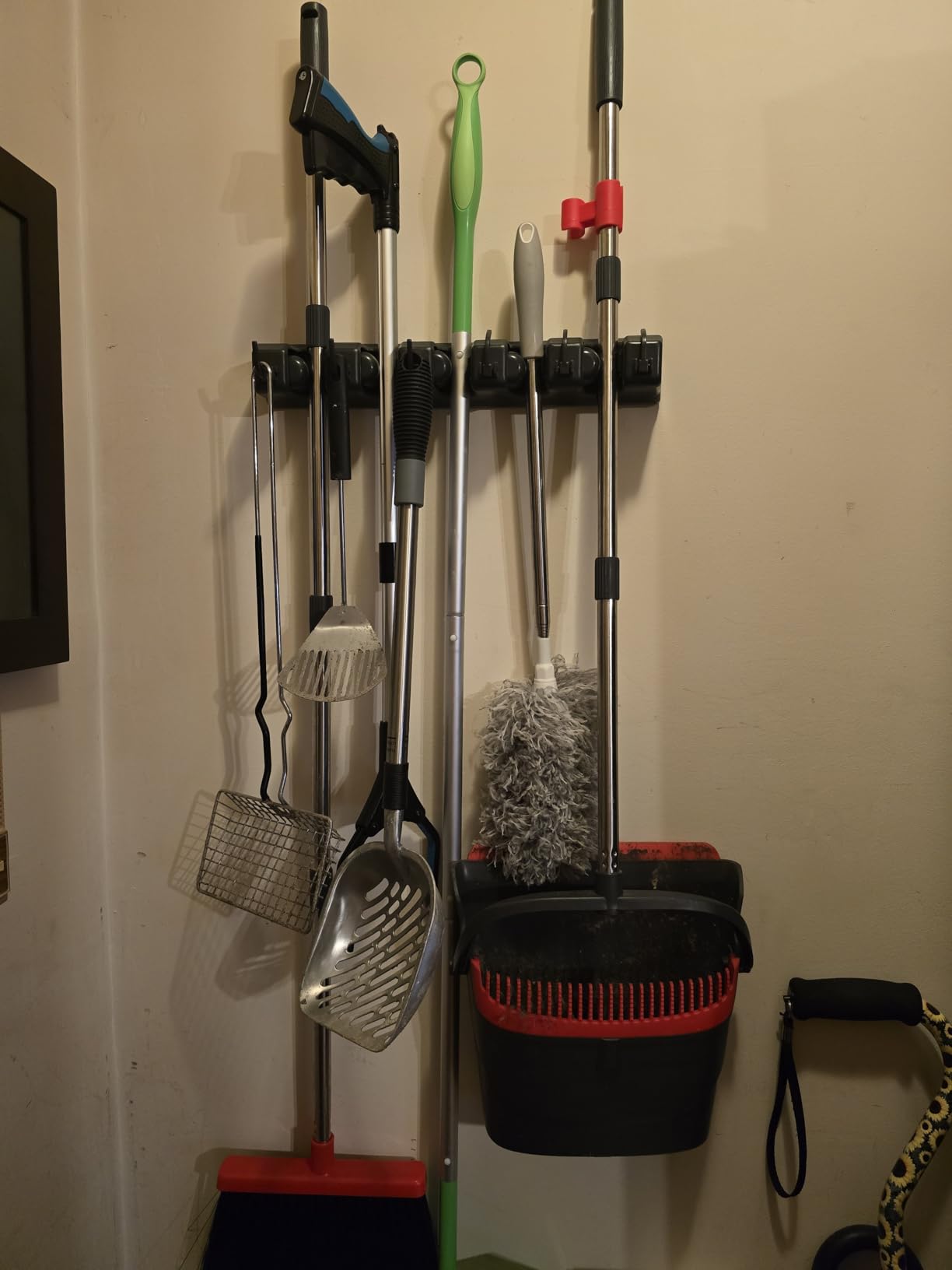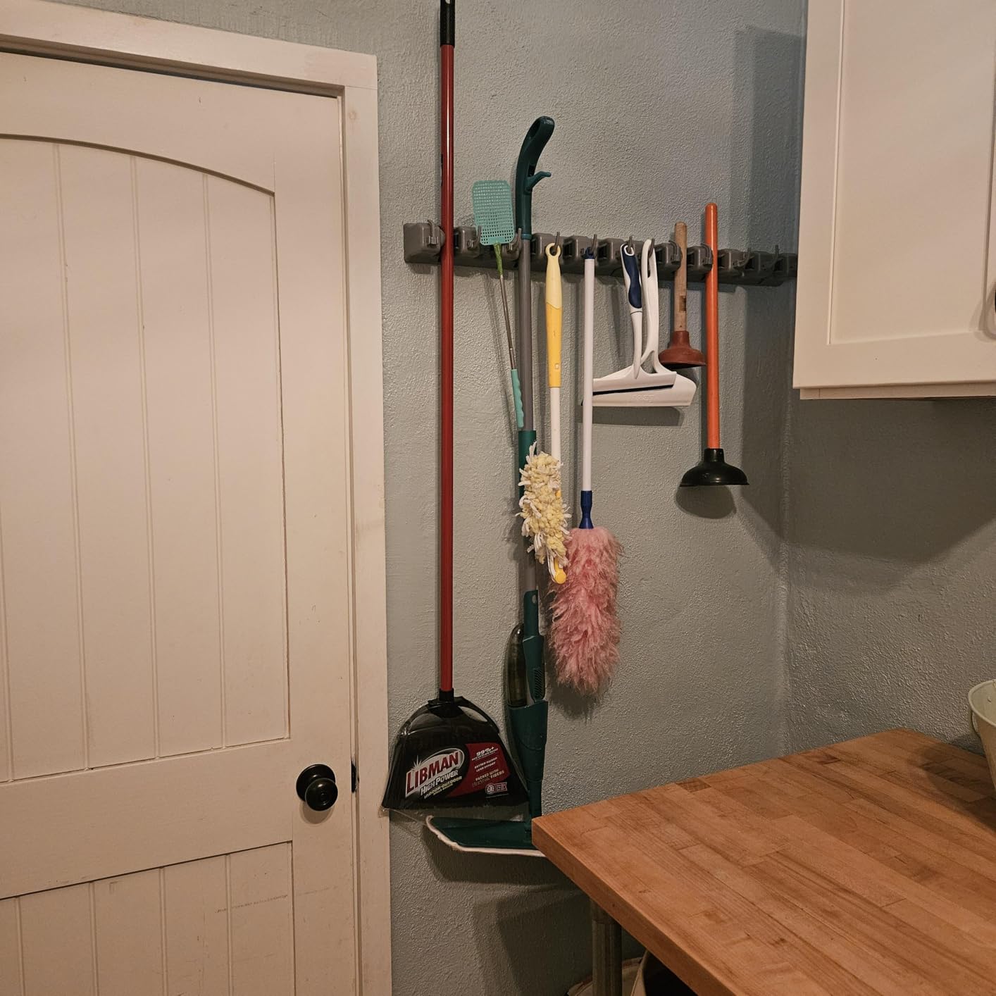¿Escobas y suapes por el piso? Ordena en minutos con el Soporte 5×6 (10 kg): 5 ranuras autoajustables + 6 ganchos para todo tu equipo de limpieza. Ideal para cocina, lavadero y baño.